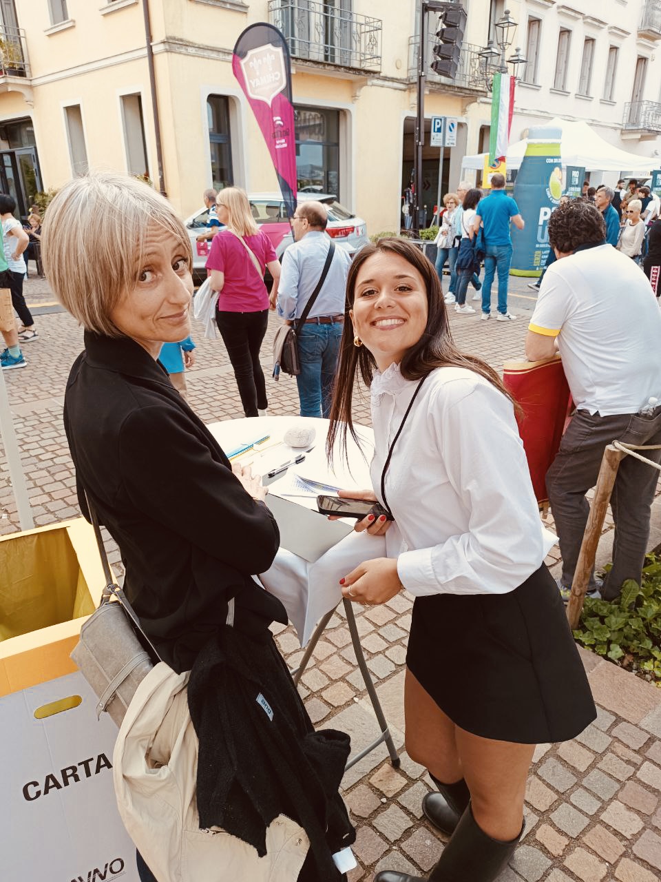 Nel frattempo Piazza Caduti nei Lager, dov’è posto lo striscione di partenza e arrivo del Criterium, si riempie di gente in attesa di vedere i propri beniamini, gli ospiti iniziano ad arrivare e con loro gli atleti e il lavoro di Beatrice e Patrizia si fa’ più fitto.